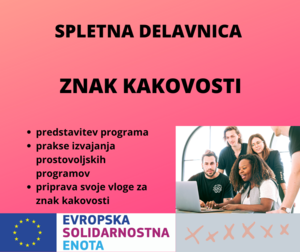 19. ter 21. maja je v spletnem okolju Zoom potekala delavnica za pridobitev znaka kakovosti v programu Evropska solidarnostna enota. Glede na to, da je za razliko od ostalih izvedb tokrat šlo za izvedbo na daljavo, je bila nekoliko prilagojena tudi izvedba le-te. Delavnica je bila sestavljena iz treh delov. Prvi del je bil video predstavitev programa, ki so si jo udeleženci ogledali individualno. V drugem delu, srečanju na daljavo, se je udeležencem pridružil Simon Kršinar iz Javnega zavoda Sotočje Medvode, ki je podelil prakse izvajanja prostovoljskih aktivnosti v vsakdanjem življenju. Nato so udeleženci, spet individualno, delali na pripravi vloge svoje organizacije za pridobitev znaka kakovosti. Po tem je sledilo še eno srečanje na daljavo, kjer so udeleženci dobili konkretnejše usmeritve v primeru dilem v zvezi s svojo organizacijo in imeli možnost postaviti vprašanja glede priprave vloge.