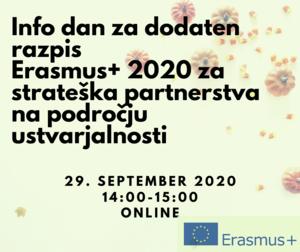 Evropska komisija je objavila Popravek Vodnika po programu Erasmus+ za leto 2020 z dodatnim razpisom za strateška partnerstva na področju ustvarjalnosti. Razpis je objavljen kot odgovor na krizo, povezano z nedavnim izbruhom virusa COVID-19. Rok za prijavo projektov je 29. oktober 2020! Za dodatni prijavni rok bomo organizirali tudi poseben spletni informativni dan, ki bo potekal 29. 9. 2020 od 14. do 15. ure. Prijavite se lahko do 25. septembra 2020! Več ...
