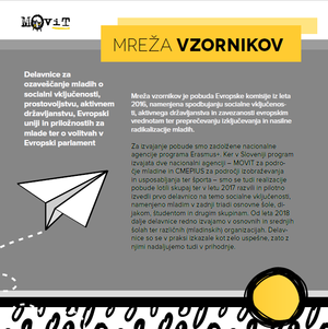 Mreža vzornikov je pobuda Evropske komisije iz leta 2016, namenjena spodbujanju socialne vključenosti, aktivnega državljanstva in zavezanosti evropskim vrednotam ter preprečevanju izključevanja in nasilne radikalizacije mladih. V okviru mreže vzornikov vam tako ponujamo možnost izvedbe petih različnih modulov delavnic, ki jih izvajata po dva trenerja iz Movitovega bazena trenerjev ali predstavniki regionalnih partnerjev Eurodesk. Če bi želeli gostiti katero izmed delavnic, najdete več informacij o delavnicah in kako izraziti vaš interes, tukaj.