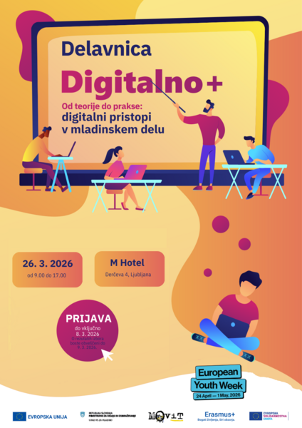 Vabimo vas na enodnevno usposabljanje Digitalno+ - Od teorije do prakse: digitalni pristopi v mladinskem delu, ki bo 26. 3. 2026 od 9.00 do 17.00 v Ljubljani. Podrobnosti in prijava >>