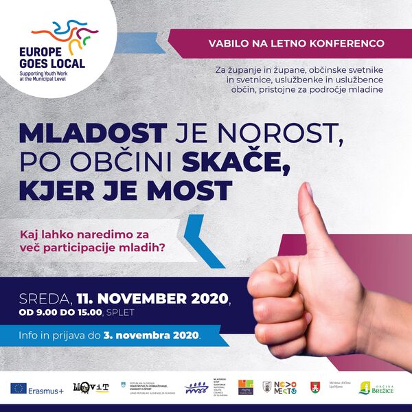 V sredo, 11. novembra 2020, ob 9.00 uri, bo v digitalni obliki v okviru partnerstva Europe Goes Local, podpora razvoju in krepitvi mladinskega dela na lokalni ravni, potekala letna konferenca za občine »Mladost je norost, po občini skače, kjer je most«.