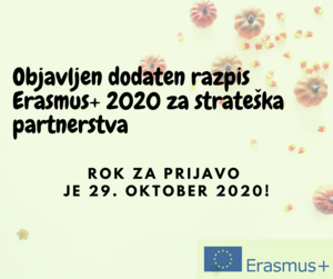 Evropska komisija je objavila Popravek Vodnika po programu Erasmus+ za leto 2020 z dodatnim razpisom za strateška partnerstva na področju ustvarjalnosti. Razpis je objavljen kot odgovor na krizo, povezano z nedavnim izbruhom virusa COVID-19. Rok za prijavo projektov je bil 29. oktober 2020!