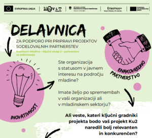 Pomembno: vse delavnice so na voljo tudi samostojno. Udeležite se lahko le ene, le dveh, ali seveda vseh treh, kar vam toplo priporočamo. Do delavnic Učinek+ in Inovacije+ imajo dostop vsi, do delavnice za podporo pri prijavi projektov Ku2 pa le vi – le organizacije, ki imate status javnega interesa na področju mladine.