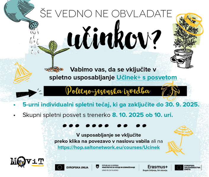 Usposabljanje Učinek+ poteka preko spleta, rešujete ga v lastni režiji. Če ga rešujete z misijo na vaš dotičen projekt, lahko le-tega zasnujete res celostno, po meri potreb ciljne skupine, organizacij in okolja, ki jih imate v mislih. Dodatno pa vas bo pri vašem razmišljanju podprl posvet s trenerko, ki bo prav tako potekal preko spleta, 8. 10. 2025!