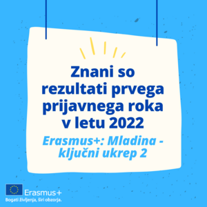 Obveščamo vas, da so bili danes objavljeni rezultati prvega prijavnega roka programa Erasmus+: Mladina v letu 2022 za ključni ukrep 2.