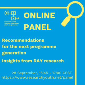 Vseevropska raziskovalna mreža RAY vas vabi, da se v torek, 28. septembra 2021, od 15.45 do 17.00 udeležite spletne okrogle mize, ki bo novo obdobje evropskih programov na področju mladine obravnavala z vidika ugotovitev raziskav o učinkih predhodnega programskega obdobja.