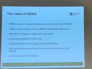 KEKS je bil ustanovljen leta 2005 kot mreža za razvoj kakovosti in kompetenc na področju mladinskega dela. Danes KEKS sestavlja 43 lokalnih (občinskih) oddelkov za mladinsko delo in okoli 250 mladinskih centrov. Za krepitev kakovosti v mladinskem delu so razvili model za zagotavljanje kakovosti, ki uporabnikom omogoča podporo pri oblikovanju ciljev in evalvacijo njihovega doseganja. Model, ki so ga razvili odraža filozofijo izvajanja mladinskega dela, katere jedro je aktivna participacija mladih in temeljni na orodju za dokumentiranje mladinskega dela Logbook ter dveh orodjih za evalvacijo, t.i. KEKS group survey in Meeting place survey. Podrobneje se lahko s področjem mladinskega dela na Švedskem in modelu, ki ga je razvil KEKS, seznanite v članku Prosti čas ali učenje – delo z mladimi na Švedskem, ki je objavljen v 37. številki revije Mladje.