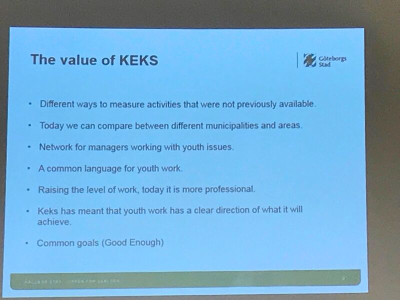 Med 21. in 25. majem se je delegacija 17 predstavnikov slovenskih občin in organizacij ter institucij, ki se ukvarjajo z mladinskim delom, mudila na študijskem obisku na Švedskem, natančneje v mestu Göteborg, kjer so spoznavali model ter način izvajanja mladinskega dela v tem švedskem mestu in sistem za zagotavljanje kakovosti v v mladinskem delu, ki ga je razvila mreža KEKS.