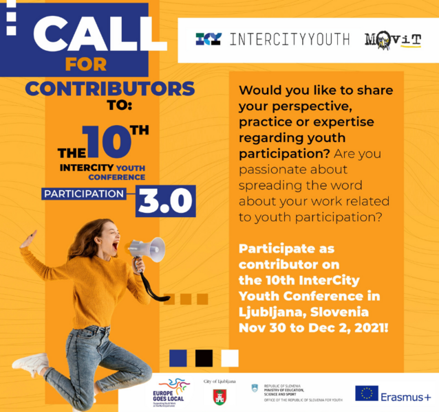 Želite deliti svoje poglede, prakso ali strokovno znanje v zvezi s participacijo mladih z drugimi? Vas navdušuje predstavljanje svojega dela na področju participacije mladih? Vabimo vas k oddaji predloga za prispevek na 10. konferenci mreže InterCity Youth, ki bo potekala od 30. novembra do 2. decembra 2021 v Ljubljani.