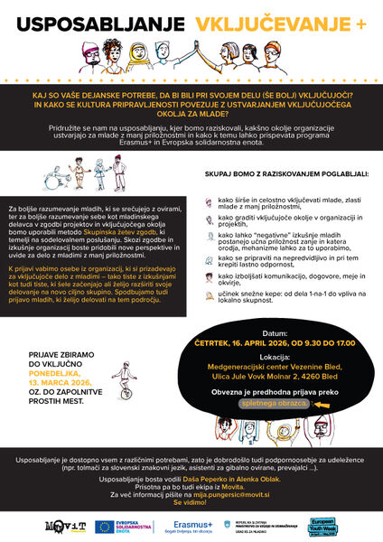 K prijavi vabimo osebe iz organizacij, ki si prizadevajo za vključujoce delo z mladimi – tako tiste z izkušnjami kot tudi tiste, ki šele začenjajo ali želijo razširiti svoje delovanje na novo ciljno skupino. Spodbujamo tudi prijavo mladih, ki želijo delovati na tem področju.