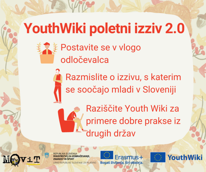 Pomagajte si s spletno enciklopedije nacionalnih mladinskih politik Youth Wiki in med primeri dobrih praks iz drugih držav poiščite ukrep, program ali politiko za mlade, ki bi jo/ga po vašem mnenju morali izvajati tudi v Sloveniji. Svoj odgovor zapišite pod objavo na Facebook strani Zavoda Movit, v kateri je bil izziv tudi zastavljen.