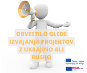 Vse organizacije, ki imajo trenutno sprejete gostiteljske ali pošiljajoče projekte z Ukrajino ali Rusijo v okviru katerega koli ukrepa programov Erasmus+: Mladina in Evropska solidarnostna enota, obveščamo, da bodo v teh dneh stopili z vami v stik skrbniki vaših sporazumov in vam predstavili možnosti glede nadaljnjega izvajanja projektov.