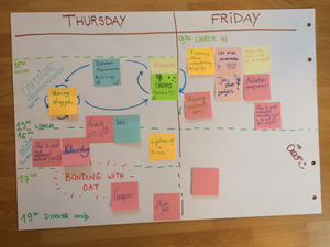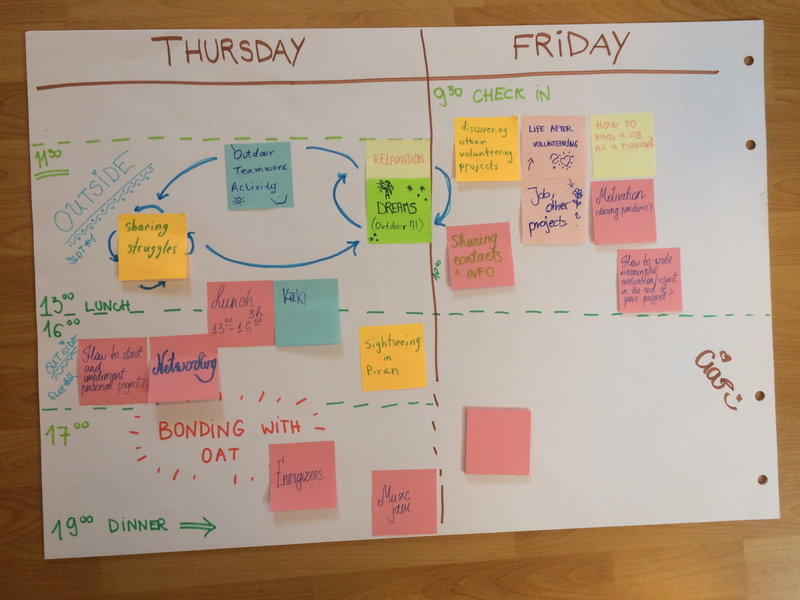 21 udeležencev ob prihodu raziskuje program, njegove značilnosti in specifike neformalnega učenja, iščejo načine, kako se vključevati v lokalno okolje, spoznavajo osnove projektnega upravljanja in se seznanjajo s konceptom osebnega projekta ter orodja Youthpass. Udeležencev na vmesnem vrednotenju je 12. Ukvarjajo se z evalvacijo projekta do sedaj, preskušajo načine, kako se soočati z izzivi in izkoristiti njihov potencial za razvoj, predvsem pa iščejo načine, kako čim bolj uspešno zaključiti preostanek projekta in kaj po njem. Vsi pa željno lovimo jesenske sončne žarke, saj veliko aktivnosti izvajamo na prostem, predvsem pa nabiramo motivacijo in navdih v dragocenih neformalnih trenutkih in pogovorih.