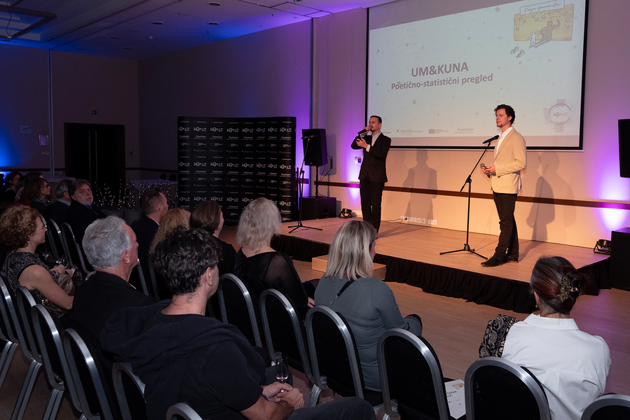 Z iskrivim improviziranim nastopom sta večer popestrila državna prvaka v freestyle rapu, izjemna v brušenju jezika, hitrih misli in kovanju rim - umetniški dvojec UM&KUNA.