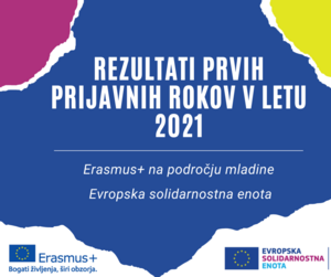 Obveščamo vas, da so bili objavljeni rezultati prvih prijavnih rokov programov Erasmus+ na področju mladine in Evropska solidarnostna enota v letu 2021. Sporazumi za sprejete projekte so v pripravi in bodo nosilcem projektov posredovani v roku 30 dni, kot tudi izhaja iz sklepov, ki so dostopni na spodnjih povezavah.