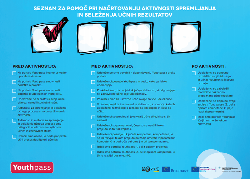 V pomoč pri načrtovanju aktivnosti spremljanja in beleženja učnih rezultatov v vaših projektih vam je lahko seznam aktivnosti (check-lista), ki vključuje pomembne korake v procesu Youthpass pred, med in po aktivnosti. Seznam lahko prenesete TUKAJ.