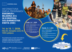 Vabimo vas na prva informativna dneva programov Erasmus+: Mladina (E+) in Evropska solidarnostna enota (ESE) v novem letu 2026, ki bosta v sredo, 14., in četrtek, 15. januarja 2026, v Hiši EU v Ljubljani.