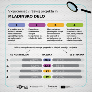 Razlike v odstotnih točkah so za posamezno trditev razvidne iz infografike. Infografika v zgornjem delu prikazuje preverjane trditve s področja mladinskega dela, v spodnjem delu pa deleže udeležencev, ki se s trditvami strinjajo, in sicer ločeno za udeležence, ki so čutili, da so lahko oziroma niso mogli prispevati svojih pogledov in idej k razvoju projekta.
