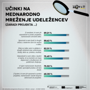 Največ udeležencev pri nas prijavljenih projektov, ki so bili vključeni v raziskavo, je prepoznalo učinke na mednarodno mreženje (povprečje med trditvami 79,77 %) in tudi na profesionalni razvoj (povprečje med trditvami 77,75 %), medtem ko je precej manjši povprečni delež udeležencev (40,1 %) zaznal tudi pozitivne učinke na njihovo družbeno, politično in okoljsko ravnanje. Pri razvrščanju področij smo si pomagali s povprečnimi deleži po področjih razvrščenih trditev udeležencev. Vendar pa takšna povprečja nimajo poglobljene izrazne moči, zato je bolj smiselno pogledati manj in bolj uspešne učinke (trditve) znotraj posameznih področij.