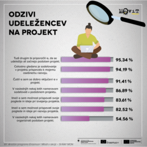 Samo dobra polovica udeležencev pa je izrazila namero po organizaciji podobnega projekta v prihodnjih letih. Organizacija projekta je vsekakor zahtevna zgodba, ki zahteva dobro ekipo in močno podporo organizacije. S tega vidika namera polovice udeležencev niti ni tako majhen delež, vsekakor pa si moramo različni deležniki prizadevati k čim večji motivaciji mladih po prijavljanju lastnih projektov, predvsem preko vstopne točke mladinskih izmenjav v okviru programa Erasmus+: Mladi v akciji in solidarnostnih projektov v okviru programa Evropska solidarnostna enota.