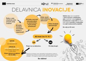 Vsaka sprememba v mladinskem delu se začne z idejo. Toda ideja zaživi šele takrat, ko jo preoblikujemo v prakso, ki odgovarja na potrebe mladih in prinaša dodano vrednost organizacijam ter skupnostim. Kako to doseči, bomo raziskovali na delavnici Inovacije+, ki bo potekala 11. novembra 2025, med 9.30 in 16.00 v Nox Hotelu Ljubljana.